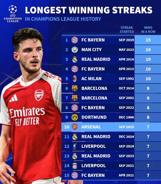 北京时间1月23日,德转统计出了欧冠历史连胜场次TOP10,本赛季联赛阶段7战全胜的阿森纳并列第10位,拜仁慕尼黑以15连胜排名第一。